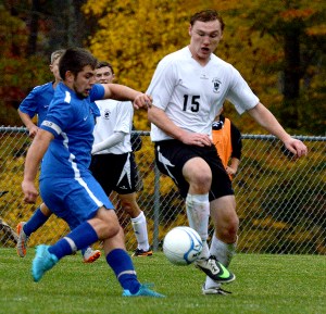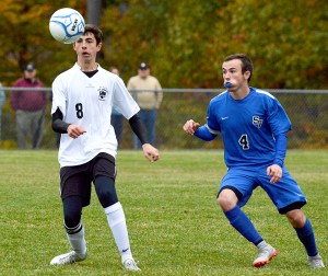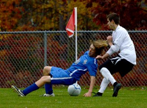 The Saints outshot the Hawks 8-2 in the second half but couldn’t break the tie. Bates and Roy had quality chances. Sacopee Valley’s Jared Jordan made a nice clear that halted a St. Dom’s odd-man rush. The Hawks had a shot by Goforth late in regulation. There was also a save by St. Dom’s keeper Alex Michaud after a ball deflected off a body in front toward the net. Michaud played in net the entire game, but Roy was the keeper during penalty kicks.
