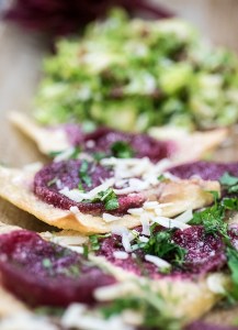 Oster’s final cooking demonstration was beet ravioli with goat cheese. Using Emery Farm beets that had been roasted in the Fireworks mobile oven, she mixed them into a paste with Sunset Acres Farm and Dairy goat cheese (all the way from Brooksville). Seasoned with herbs, salt and pepper and held together by an egg, this mixture was scooped into wonton wrappers and quick boiled in small batches. The rich flavor of the goat cheese was smoothed out by the earthy flavor of the beets and served with a side of … raw Brussels sprout salad.