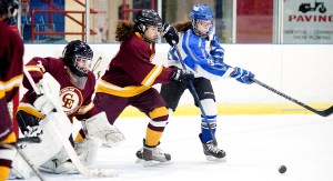 The Capers showed signs of life in the latter stages of the second period, and made sure Blue Devils goalie Megan Gosselin was awake in the process. The sophomore netminder was forced to make consecutive tough saves — after making just five routine ones up to that point — with 5:30 left. The Capers then placed shots on net on three straight faceoffs to make the Blue Devils sweat for the first time, as Gosselin made as many saves in a matter of seconds as she had during the initial 24 minutes of game action.