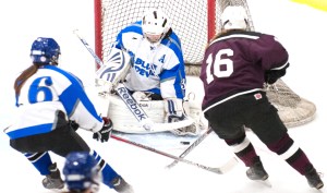 The Blue Devils didn’t get their first shot until late in the period and produced a few chances. Corinne Laberge had the best try for the Blue Devils with a backhander early in the second. Greely controlled the rest of the period, outshooting the Blue Devils 12-2.