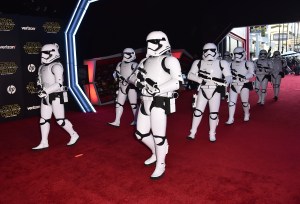 The premiere’s red carpet kicked off Monday with Stormtroopers marching and droids rolling past cameras before the film’s stars arrived. John Williams’ soaring score played in the massive opaque tent spanning four blocks in Hollywood.