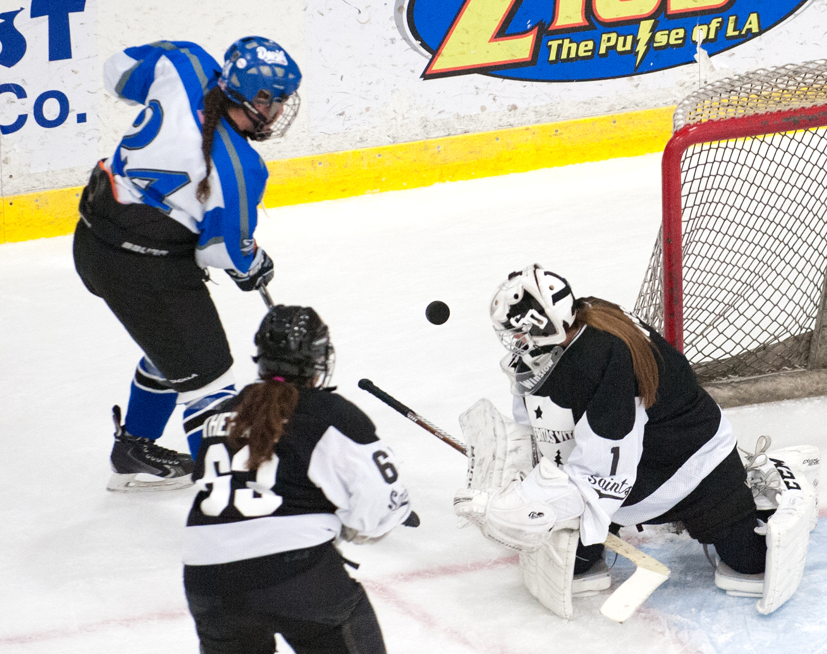 Another Saints freshman, defender Emma Theriault, scored 30 seconds into the second period, as her shot from the left point found the back of the net past Gosselin.