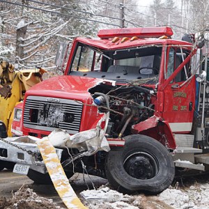HARRISON — Slick roads and mechanical problems caused a Harrison firetruck to roll over on Route 35 on Sunday afternoon.