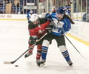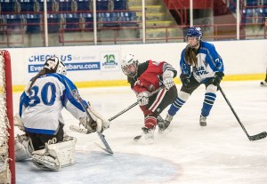 The Blue Devils (10-4-1) jumped on the board first, just like in the season’s first matchup. Katie Lemieux scored from the left circle on a power play with less than five minutes left in the first period. The Blue Devils dominated in shots on goal in the first (12-2), yet held just a 1-0 lead after 15 minutes. Some of that had to do with the strong glove work of Red Hornets goalie Sarah Hammond, who used her softball background to make some tough glove saves.