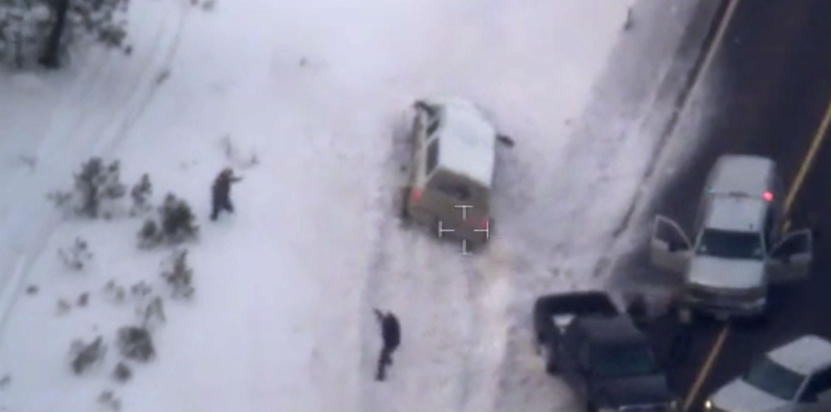 The video, shot by the FBI from aircraft, shows Bundy’s vehicle stopped by police on a road. He and an occupier riding with him — Brian Cavalier — were arrested. A white truck driven by Finicum was stopped but took off, with officers in pursuit. The video shows Finicum’s vehicle plowing into a snowbank when encountering a roadblock.