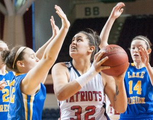 With a second life, the Patriots seized the opportunity, and seized control of the contest. Center Alanna Camerl made a layup off the opening tip, and after a missed layup by Lake Region, Alicia Dumont drained a 3 to give the Patriots a 47-42 lead.