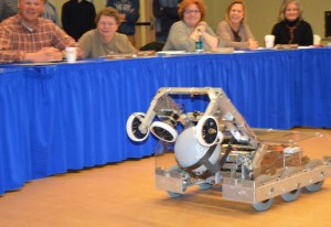 Student Dylan Roberts appeared to be using a remote control with a laptop computer to operate the robot as fellow members the Blue Crew robotics team, Ben Andrews, Tucker Barber and Thomas Marshall, looked on.