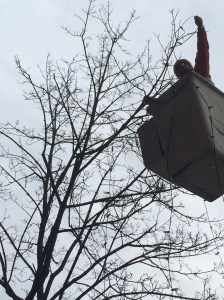 Putting an official end to the holiday season on a fittingly balmy day, Public Works highway workers Nick Poland and Don Gilks perched in cherrypickers 45 feet in the air off Lisbon Street and freed strands of Christmas lights from downtown trees, cutting zip ties with tin snips.