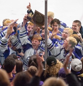 Roderigue dished out assists on Waterville’s first two goals, which rallied the North champion Purple Panthers (19-1-1) back from an early 2-0 deficit. Less than three minutes into the second eight-minute overtime the junior defenseman took a pass from classmate and fellow blue-liner Matt Jolicoeur from left to right. Roderigue turned and fired on net, and Latham couldn’t respond to the shot before it hit the back of the net.