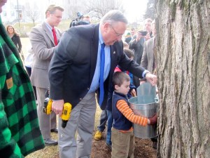 As soon as the governor finished drilling a hole in a huge maple tree across from the State House, the sap started running.