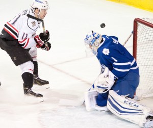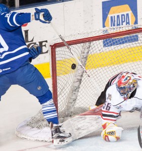 The Marlies scored their first goal of the second period nearly the same amount of time into the frame that they scored their first goal of the first. Brendan Leipsic scored on a goal that was originally called off, but after a quick review was deemed good. Portland skater Corban Knight tried to reel the puck in at the goal line with backup goalie Sam Brittain out of the net, but Knight was too late in stopping Leipsic’s from crossing the threshold.