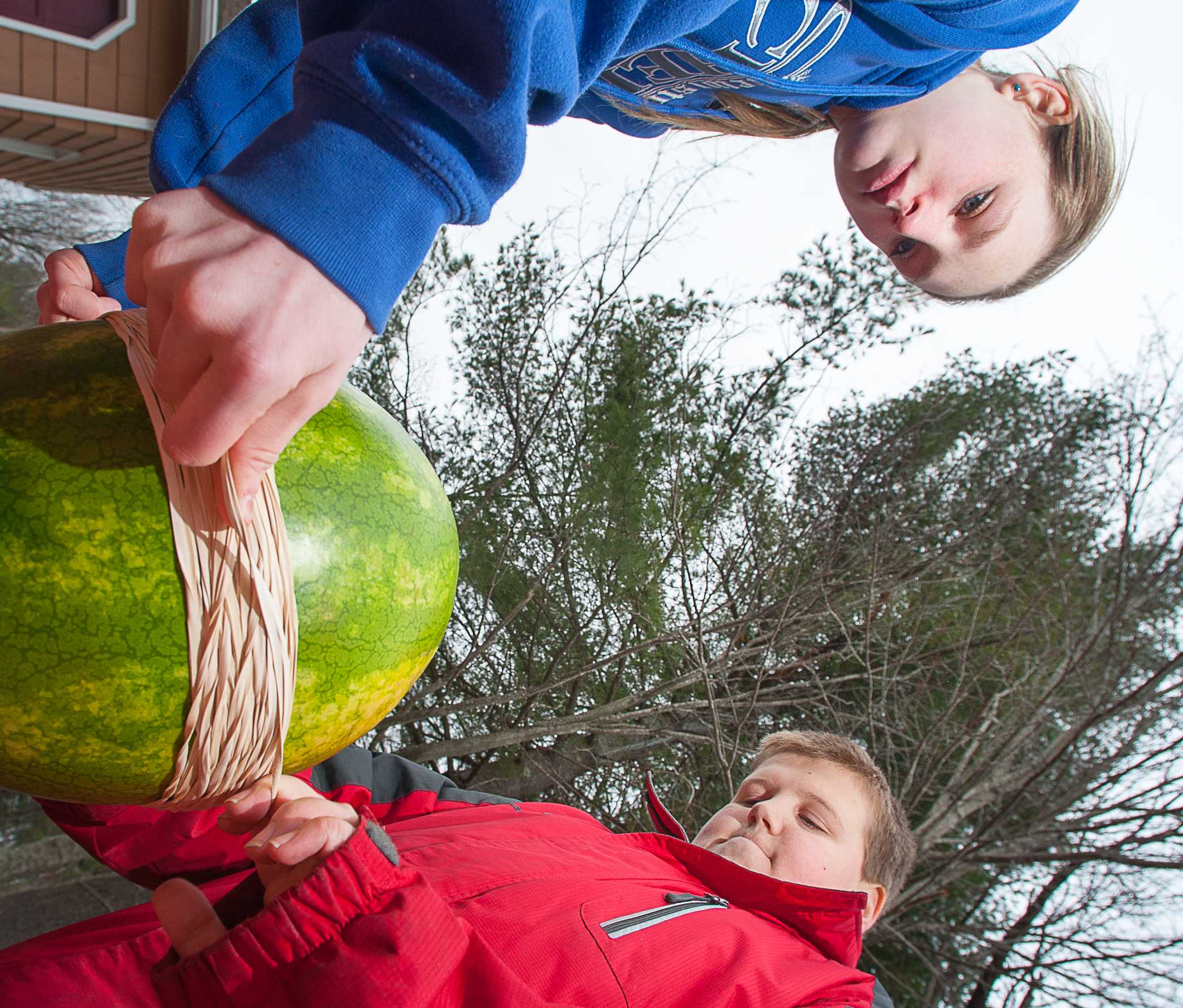 Logan Morin and Luke DeCoster, 13-year-old students at Lewiston Middle School, got together with a few neighborhood friends to wrap over 1,000 rubber bands around the middle of a watermelon on July 6, 2015.