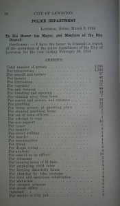 I hold in my hand a report from the Lewiston Police Department summarizing a year’s worth of crime and mayhem in 1914. Although to be fair, some of what they called crime in 1914 today sounds like hopping good times.