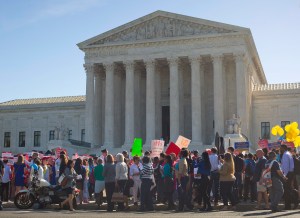 As arguments began, hundreds of pro-immigration demonstrators filled the sidewalk in front of the court and spilled into the street, leading police to close the road to traffic. Demonstrators held signs that read “Keep Families Together” and chanted “Si se puede,” which is Spanish for “Yes we can.”