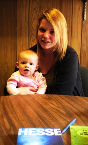 Adrianna Martin, 18, of South Paris sits bouncing her year-old daughter Ava-Lynn on her knee. Ava-Lynn grins and grabs a book on the table.
