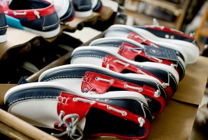 Production started in mid-September on 2,000 pairs of the special red, white and blue Olympic boat shoes.