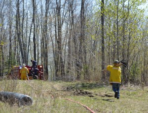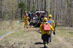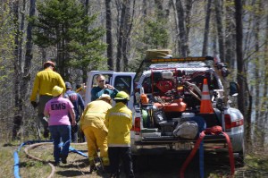 Smoke was spotted from Mile Hill Road in New Sharon, leading firefighters to the scene. They used Indian backpacks and pumps, pick axes, brush rakes and other hand tools to extinguish the fire. Tanker trucks were filled from Clearwater Pond in Industry.