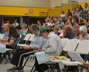 FARMINGTON — A Regional School Unit 9 school director asked two Farmington women to hold questions Wednesday night while they were waiting for the districtwide budget meeting to vote on a proposed $32.97 million school budget.