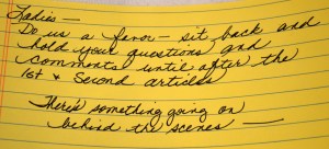 The note read, “Ladies – Do us a favor – sit back and hold your questions and comments until after the 1st + second articles. There is something going on behind the scenes.”