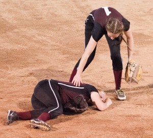 Richmond added four more runs in the sixth. Anair singled in a pair. Harriman scored on an error and Patterson had an RBI hit when her hard liner hit Litchfield. She slumped over as if she were knocked out. Coaches and medical personnel rushed to her and after a few moments, she was able to walk off the field. Coaches and teammates returned to the field after the inning to find one of her lost teeth.