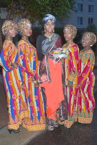 Her wedding party wore matching gowns with gold accents and headdresses.