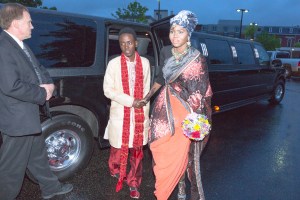 The bride and groom arrived in a black stretch limousine, looking like royalty. He donned a white, embroidered robe. She wore a long gown and a headdress.
