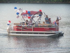 Lineup will be at 7:45 p.m. in front of the Colley/Shibles Camp, the red camp on the point across from the Island. The boat parade will start down one side of the lake about 8 p.m. and return in time to dock or have boats in place for the fireworks.