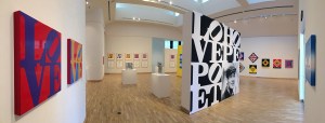 Indiana’s “ALPHABET” silkscreen series is hung on two walls in the center of the gallery and Nine “LOVE” silkscreens line two other walls of the Olin art Center.
