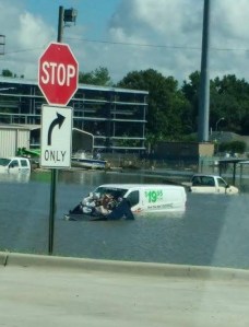 On his way to the shelter, he saw camper trailers half-deep in water in a parking lot. Interstate 10 was flooded on both sides, forcing people to take a two-mile detour.