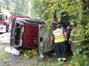 NAPLES — A Casco woman was flown from a crash scene in Naples to a Lewiston hospital Saturday after the vehicle she was driving struck trees and was enveloped with flames.