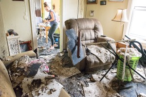 At the scene Monday, men with saws cut plywood and boarded up windows. Red Cross staffers and volunteers interviewed residents and provided comfort, water and doughnuts.