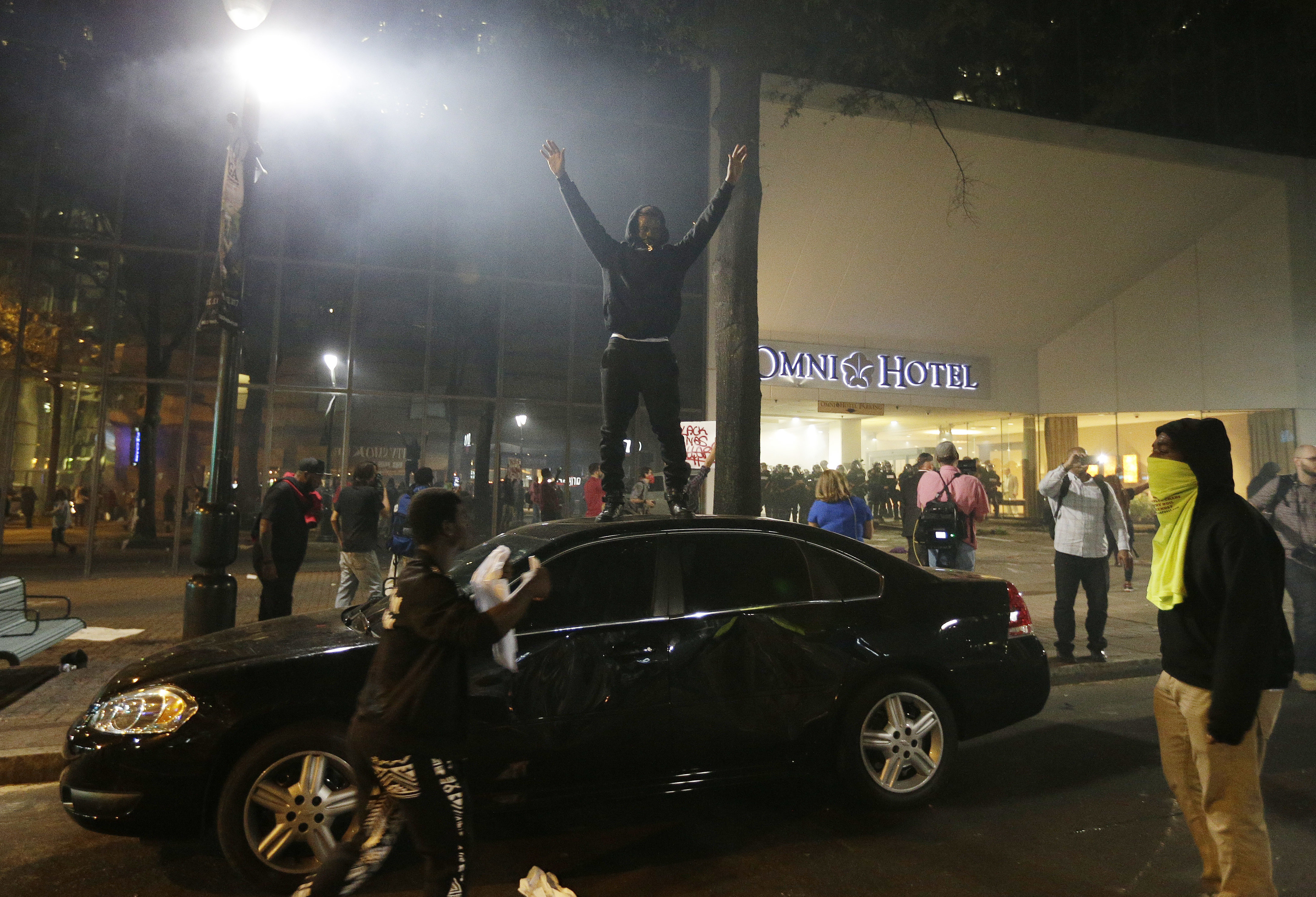 One man was shot and killed as protesters gathered near police in riot gear at an upscale downtown Charlotte hotel Wednesday night. The man was not shot by a police officer, the city of Charlotte said on Twitter.