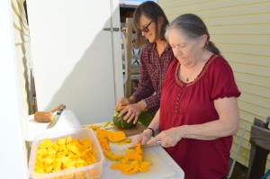 In back of the booth, Cat Taylor of East Livermore and Ellie Long of Farmington were peeling and chopping buttercup squash. Dozens of them were donated this year. They usually grow the squash at the church but the person who is instrumental in doing that was very sick this year, Taylor said.