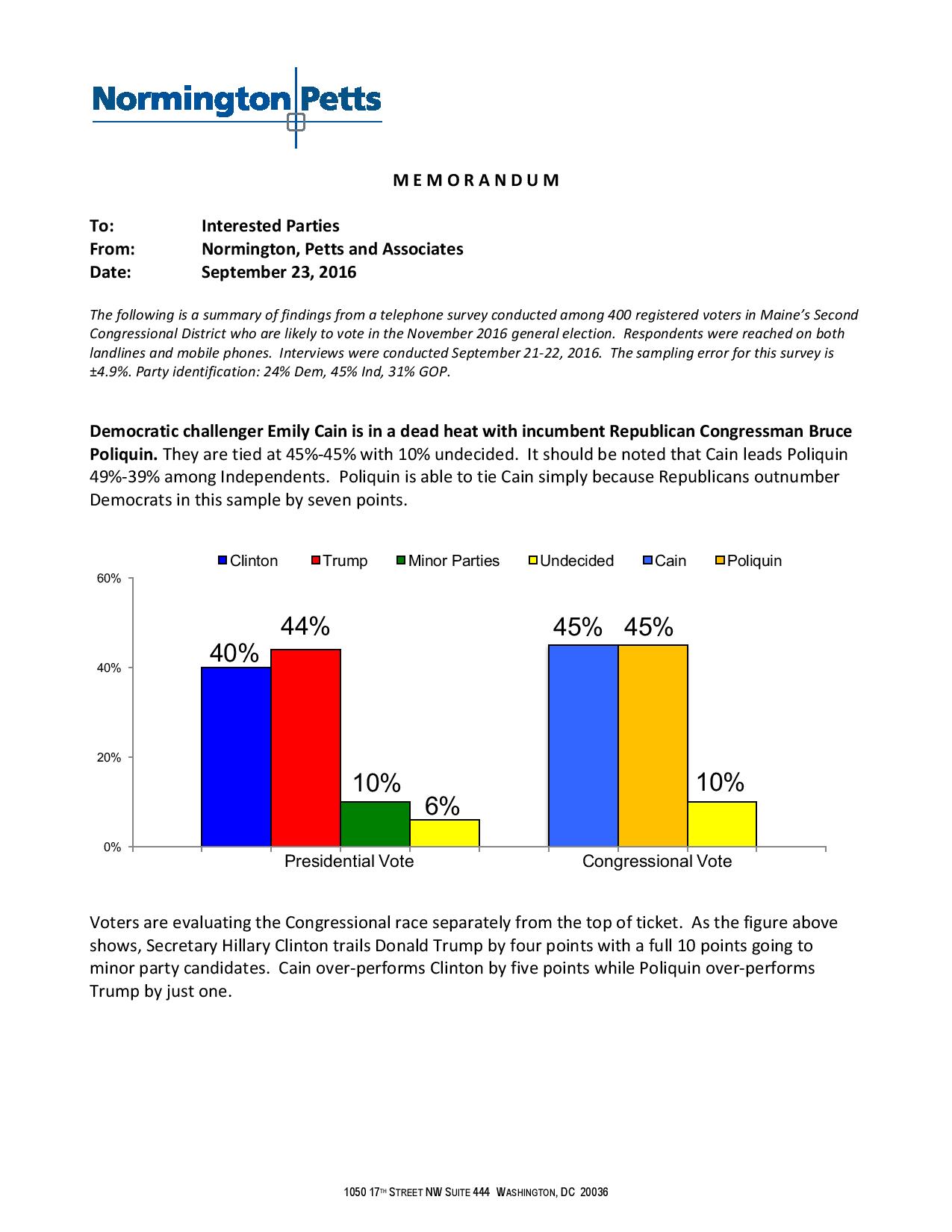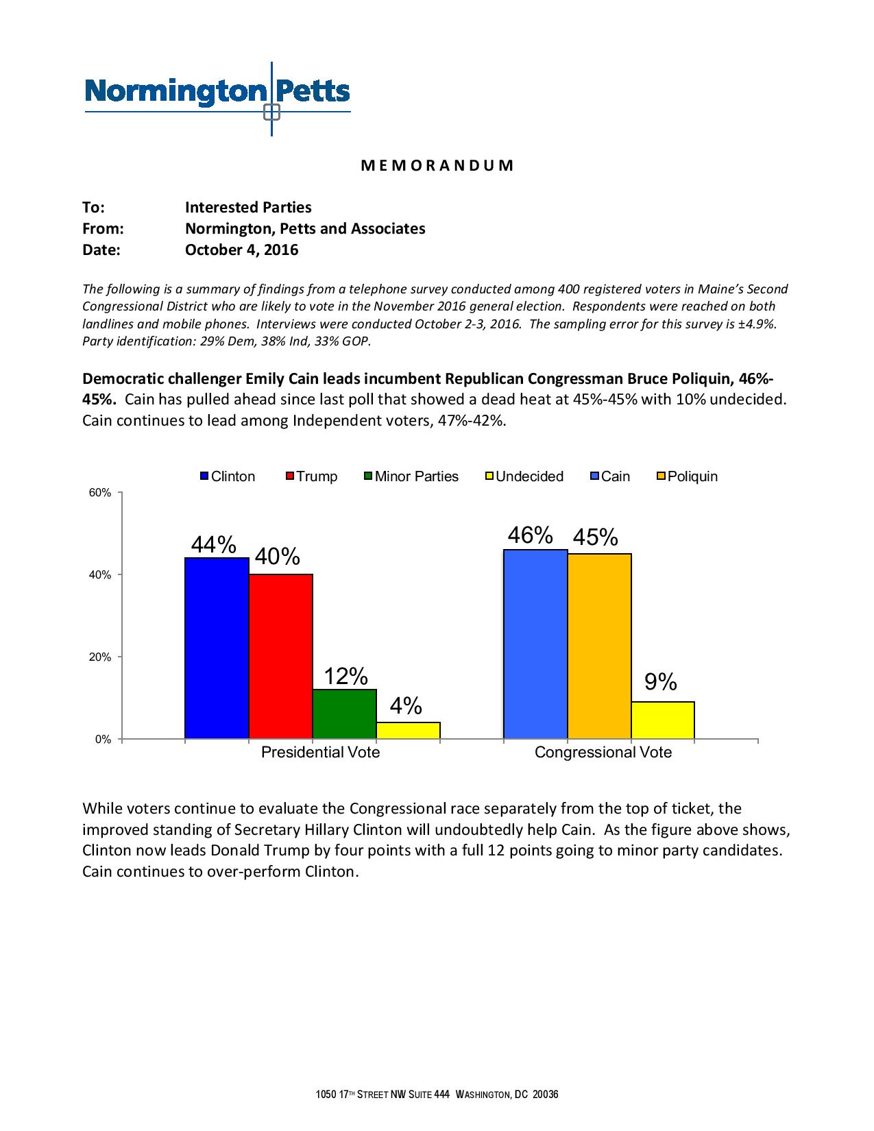The two polls, by Washington, D.C.-based Normington Petts, found as recently as Oct. 4 that Cain was up by 1 point — well within the margin of error — and that 9 percent of likely voters in the district remained undecided.