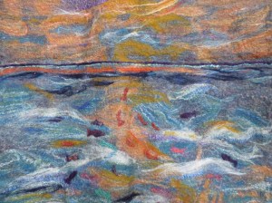 “You can see my style in watercolor and mixed media work transferred to my work creating wet-felted, three-dimensional fine art and fine crafts,” she said. “I have spent much of my life as a writer, journalist and changemaker working with social fairness and empowerment kinds of endeavors. However, the news of our world, wherever we live, is filled with issues, crises and intentional badwill. It can overwhelm our ability to see the beauty that remains around us. The light, color, a tiny speck of life can inspire the artwork or writing that I commit to each day. And, I do work at art every day. I hope that I can transmit some of the miraculous beauty that insists on continuing, whatever we human beings do in this world. Texture, light, color, content, warmth, coolness, are in what my hands make.”