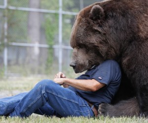 Sitting on the ground next to Jimbo, Kowalczik shrugs at the thought of personal danger from his bear buddies.