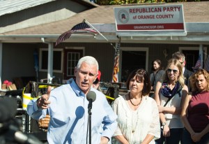 Pence’s visit to the state comes two days after a local Republican Party office in Orange County, North Carolina, was damaged by a Molotov cocktail thrown through a window. No one was in the office at the time. Local Republicans resumed operations Monday outside their damaged office.