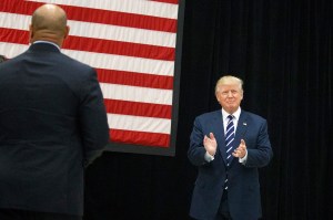 Taking the stage nearly two hours late at Open Door Bible Baptist Church’s Christian Academy gymnasium, Trump got an enthusiastic welcome from 1,000 of his faithful supporters, who cheered his denunciations of Democrat Hillary Clinton and vows to “make America great again.”