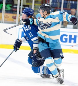 A bit of controversy occurred about halfway through the second period while L/A was on the man advantage. It looked like the Fighting Spirit were going on a two -man advantage when Vrees got a stick into the face and went down. No call was made and Vrees went to the bench.
