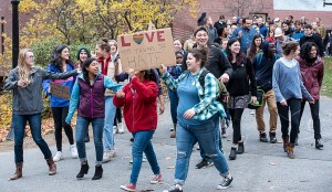 For junior Sammy Purnell, who got out of a poetry class to join in, the rally was a nice break from the pall that’s hung over the mostly liberal campus since election night Nov. 8.