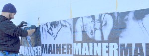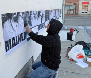 FARMINGTON — The mural “Mainers” was reinstalled Monday on the wall of Java Joe’s Corner Cafe by street artist Pigeon.