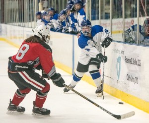 Junior forward Saige Arsenault got the Red Hornets’ lone goal of the period at 8:46 by outworking a crowd in front of the net for a rebound of Samantha Martineau’s shot from the point.