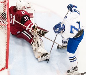 It took a 5-on-3 power play to get the scoring started. Dustin Larochelle put a shot off Fournier and in with just one second remaining on the two-man advantage midway through the first period. That came on the Blue Devils’ 10th shot on goal.