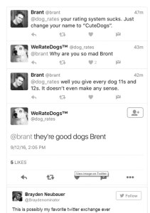 Here is how “They’re good dogs, Brent” began: “Brent” is Brant Walker, who got into an argument in September with a parody Twitter account that rates dogs online. Walker felt that the dog rater was too easy on the dogs, who are theoretically rated on a scale of 1 to 10. The dog rater, whose name is Matt Nelson (he tweets as @dog—rates), disagreed — pretty much every dog deserves a 10, and many deserve, say, an 11 or 12. Or more. The defense he gave for his generous evaluations of the worth of the internet’s dogs was very funny, and it went viral.