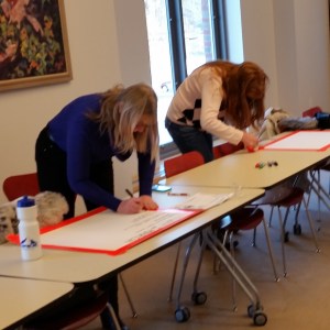 One of those who responded, Elizabeth Eams of Lewiston, recently sat with a dozen other women in a room at Bates College working on a sign that read, “Great Without Hate.”