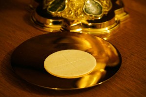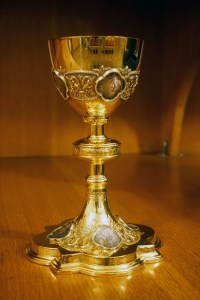A friend or family member will give a priest a chalice with accompanying paten at his ordination. The round metal paten is fitted to cover the chalice and holds the Eucharistic bread, which will be consecrated by the priest during Mass.