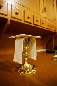 The sacristy is the behind-the-scenes staging area at the Basilica of Saints Peter and Paul and houses the priests’ bibles, vestments and all of the many liturgical chalices and linens used during Mass. It is a room off the high altar where the priests, altar boys and sacristans gather before worship and prepare for service. One of the key preparations that takes place here involves the ceremonial veiling of the chalice that holds the sacramental wine and supports the communion wafer.