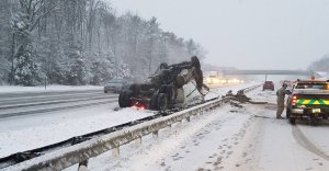 OGUNQUIT — Officials say a southbound tractor trailer slid into a guard rail and rolled over Wednesday night at Mile 15 on Interstate 95.