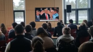 As Donald Trump took the oath of office Friday, about 75 Bates students and professors watched in silence on two large-screen televisions.