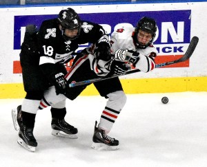 The Red Storm, who are using the Colisee in Lewiston as their home rink this season, battled back. Pulling the goalie with about two minutes to play, they forced the puck deep and kept the Saints hemmed in.